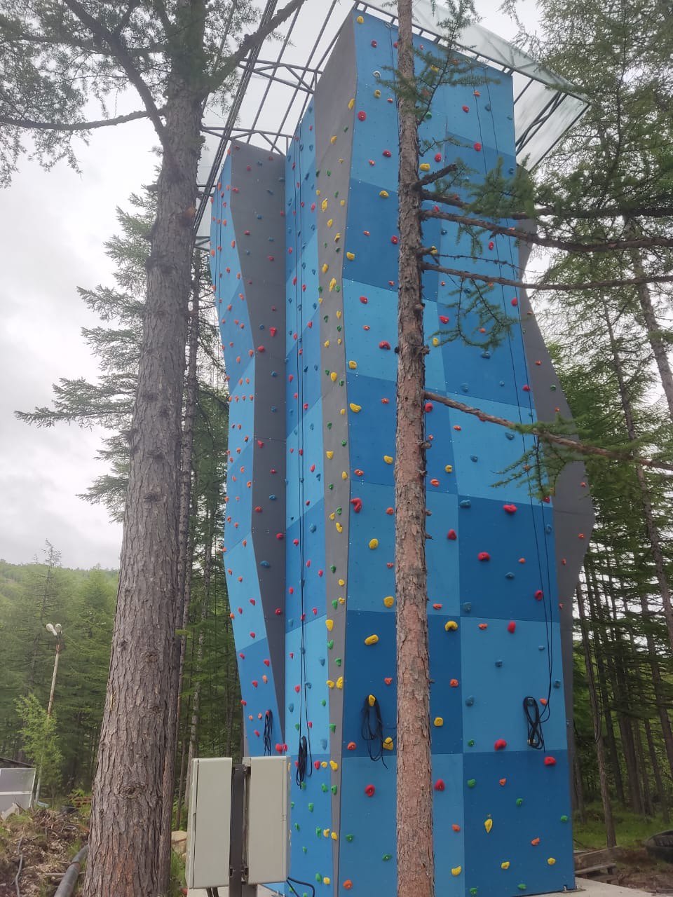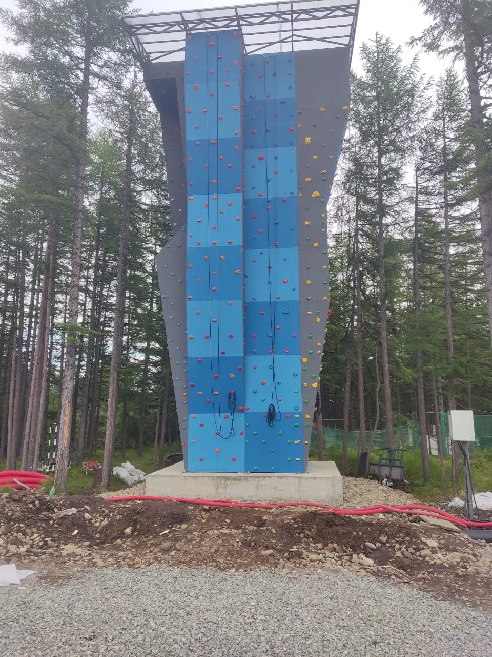 Наша команда не боится новых сложных вызовов. По запросу наших клиентов мы реализовали 12 метровую башню. Она имеет основание шириной 3 метра. Скалодром прикрывает крыша большой площади.